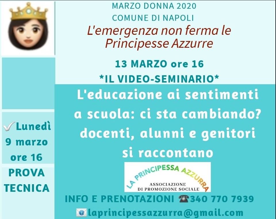 Riuscitissimo il nostro primo esperimento di seminario online! Avremmo dovuto partecipare al Marzo Donna del Comune di Napoli con due eventi: il primo un seminario con docenti, genitori e studenti sull’educazione ai sentimenti a scuola, il secondo una rassegna dei lavori svolti dalle classi che avrebbe dovuto tenersi al PAN. Data l’attuale emergenza nazionale sembrava che nessuna delle due cose fosse possibile.Invece, sfruttando anche le competenze delle docenti del liceo Mercalli, che già utilizzavano la piattaforma per la DAD (didattica a distanza), siamo riuscite a tenere il nostro Seminario sull’educazione ai sentimenti a scuola. L’incontro ha visto la partecipazione di più di venticinque persone, tra docenti, genitori e alunni, tutti in qualche modo coinvolti dal percorso, patrocinato dal Comune di Napoli, conclusosi da poco al Palazzetto Urban, “Le Parole per dirlo”. Molti gli elementi emersi. Gli alunni hanno espresso un vero e proprio entusiasmo per le attività di educazione ai sentimenti svolte dalle docenti, sottolineando come siano azioni che portano le classi a diventare gruppi solidali, in cui ci si sente protetti e liberi di esprimersi senza paura di essere giudicati. Quindi il portato di questo tipo di didattica non è solo quello di far emergere i vissuti emotivi e acquisirne maggiore consapevolezza, indispensabile per una riflessione sul sé e sulla relazione con l’altro. Il risultato è anche quello di costruire un legame diverso e positivo all’interno del gruppo classe. Ed è esattamente questo “effetto collaterale” l’obiettivo essenziale, a nostro parere, se si vuole costruire una cultura del rispetto e combattere sessismo, razzismo e bullismo.