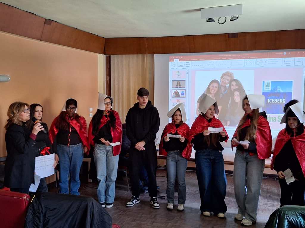Per i dibattiti e gli approfondimenti si è partiti dalla visione dei film Gloria (Margherita Vicario 2024, un po’ sulla falsariga di Lavinia fuggita di Anna Banti, racconta l’oppressione femminile nel Veneto dell’800 in campo musicale), Green Border (Agnieszka Holland 2023, storie di abusi vergognosi su migranti siriani) Il ragazzo con i pantaloni rosa (Margherita ferri, 2024, su un ragazzo suicida a causa di cyberbullismo omofobo) La treccia (Laetitia Colombani, 2024, tre donne diversissime alle prese col problema della sopravvivenza). Anche la visione dello spettacolo “La semplicità ingannata, Satira per attrice e pupazze sul lusso d’esser donne”, che prende spunto dalle Clarisse di Udine per mettere in scena una storia di resistenza e ribellione femminile, ha fatto parte di questo percorso di riflessione guidata. Infine, in particolare per la scrittura libera e la drammatizzazione ci si è avvalsi di due romanzi: “Pucundria” di M. Rosaria Selo (2024) e de “Il racconto dell’ancella” di M. Attwood (1985). La attività di educazione ai sentimenti svolte a partire dal romanzo di Selo hanno avuto poi uno sbocco nell’incontro del 26 febbraio nella sede di Fondazione Premio Napoli, dove è stato possibile il confronto con l’autrice e con altre studentesse e studenti. “Il racconto dell’ancella”, invece, è stato drammatizzato e messo in scena il 7 marzo in un evento finale all’Unitre, dove è stato possibile un confronto di idee e di opinioni tra persone di diverse generazioni.